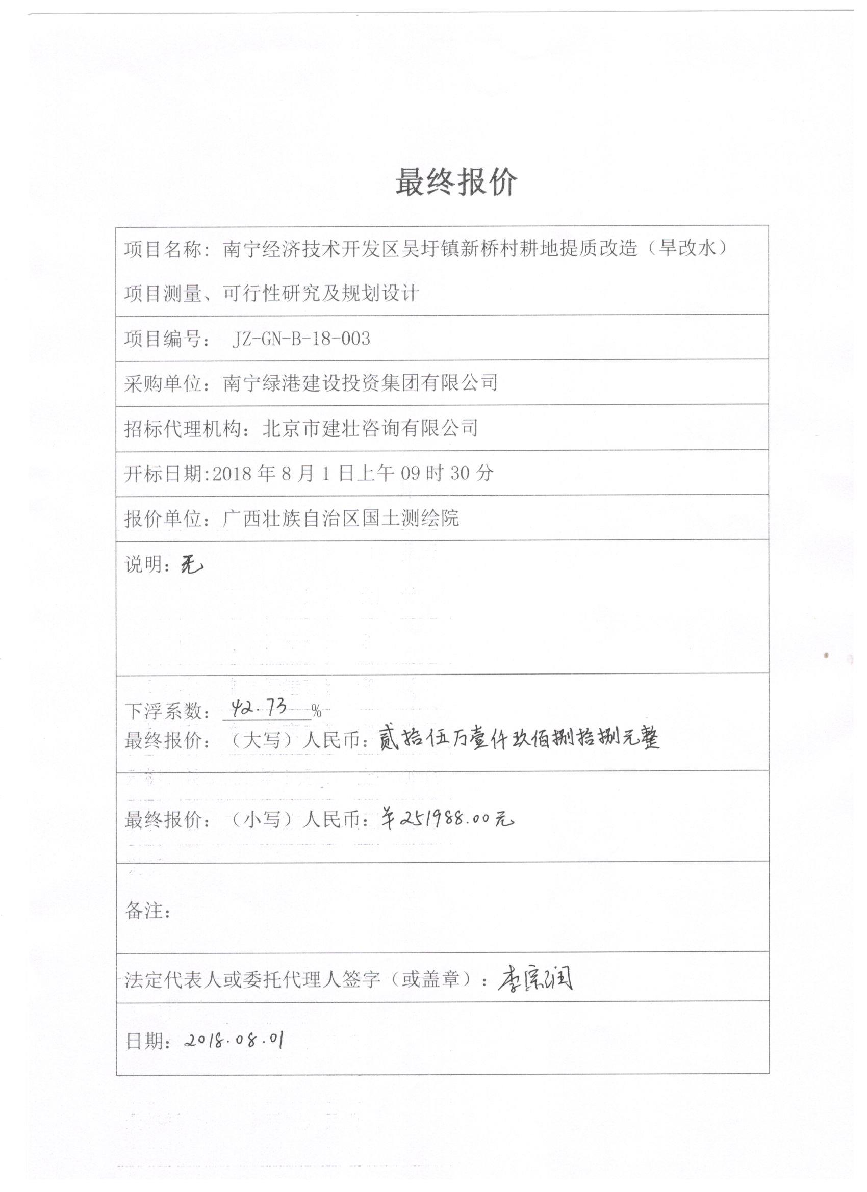 北京市建壯咨詢(xún)有限公司受南寧綠港建設投資集團有限公司委托,根據《中華人民共和國政府采購法》等有關(guān)規定,于2018年8月1日就南寧經(jīng)濟技術(shù)開(kāi)發(fā)區吳圩鎮新橋村耕地提質(zhì)改造(旱改水)項目測量、可行性研究及規劃設計以競爭性磋商方式進(jìn)行采購,現就本次采購的成交結果公告如下: