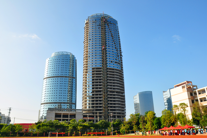 《建設中的綠港國際中心》(榮鑫公司 趙志業(yè))圖片說(shuō)明:綠港國際中心正在做外墻玻璃裝飾施工,在陽(yáng)光的照耀下美麗而雄偉。球場(chǎng)上的運動(dòng)員意氣風(fēng)發(fā)。預示著(zhù)綠港集團充滿(mǎn)活力。