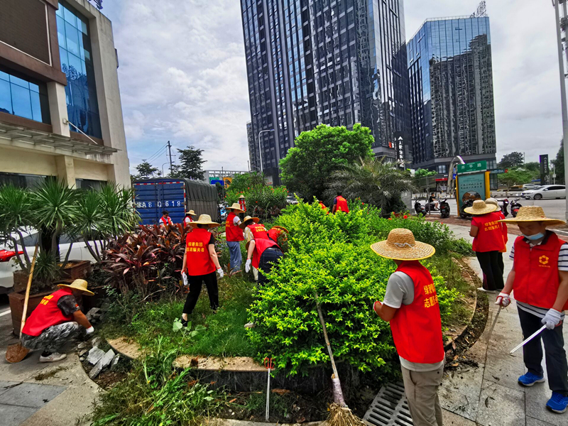 綠港集團員工不畏烈日在花圃進(jìn)行垃圾清理